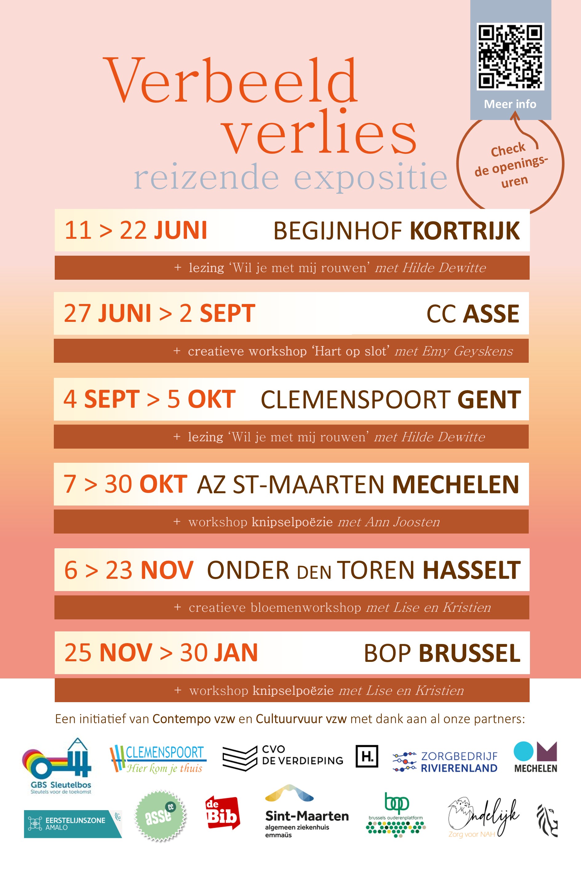 Wij laten kunst het verhaal vertellen! De apotheose van het warme traject is een reizende expo doorheen Vlaanderen en Brussel in 2025. Op elke locatie kan je ook deelnemen aan een creatieve workshop of lezing omtrent rouw. In Asse zullen de kinderen van het schakelklasje van De Sleutelbos extra kunstwerken maken voor de expositie. In Hasselt stellen de cursisten van de afdeling Bloemkunst (CVO De Verdieping) mee tentoon.