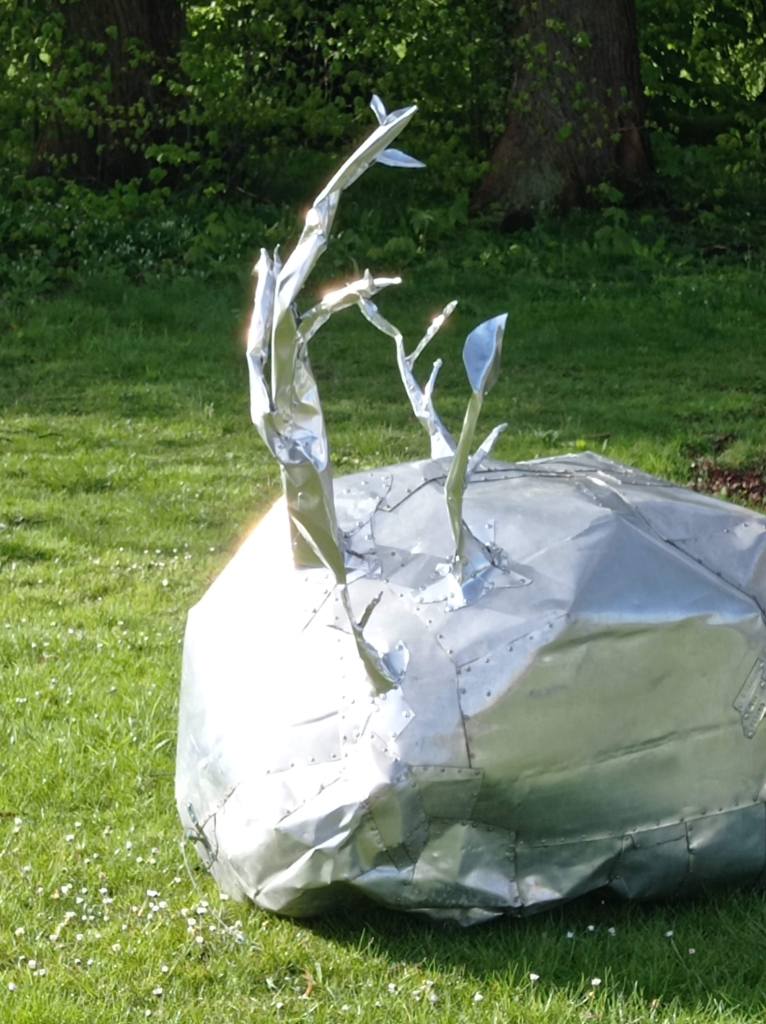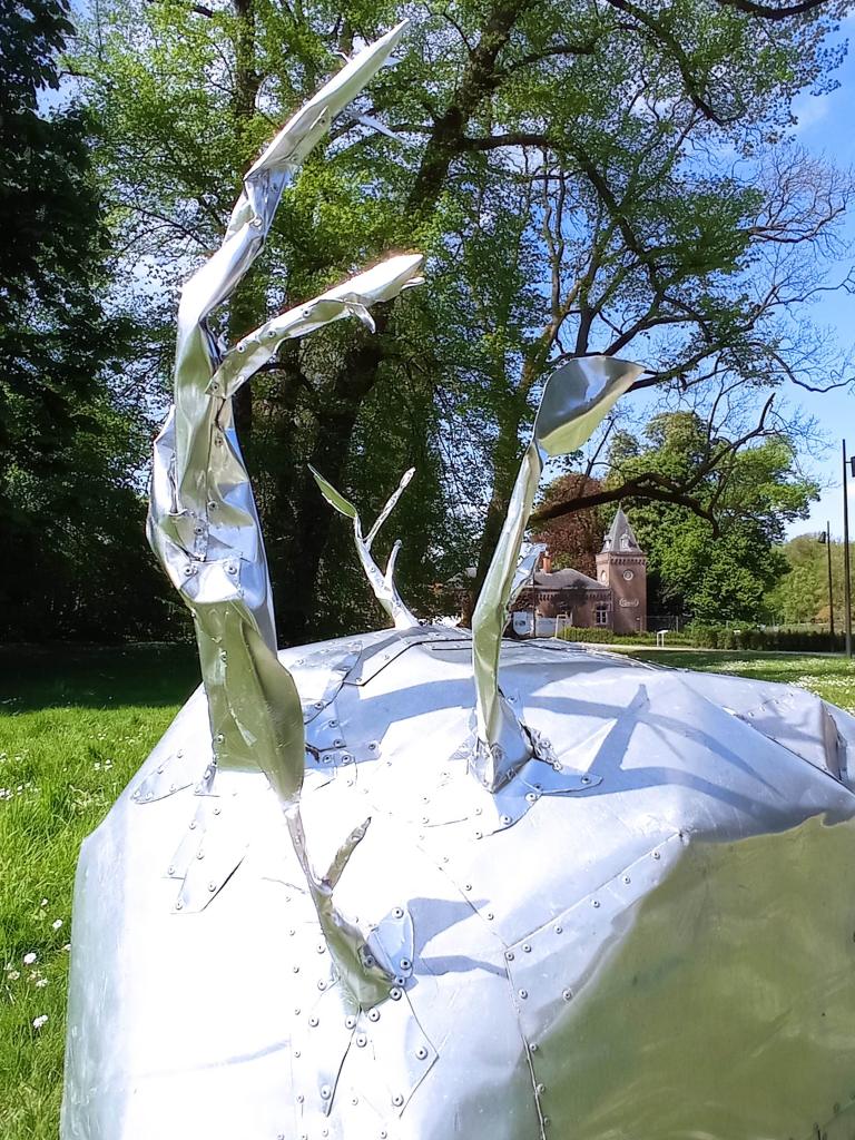 Uitvoering in aluminium en klinknagels: door de uitvergroting en uitvoering in een vreemd materiaal aan het onderwerp zelf, herkent de mens de natuur niet.