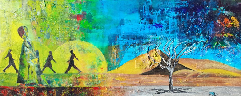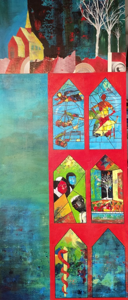 Dit druk ik uit op een semi-abstracte manier. In grote kleurrijke vlakken in, naast en onder elkaar. Buitelend naar de schaduw waar schoonheid anders klinkt.