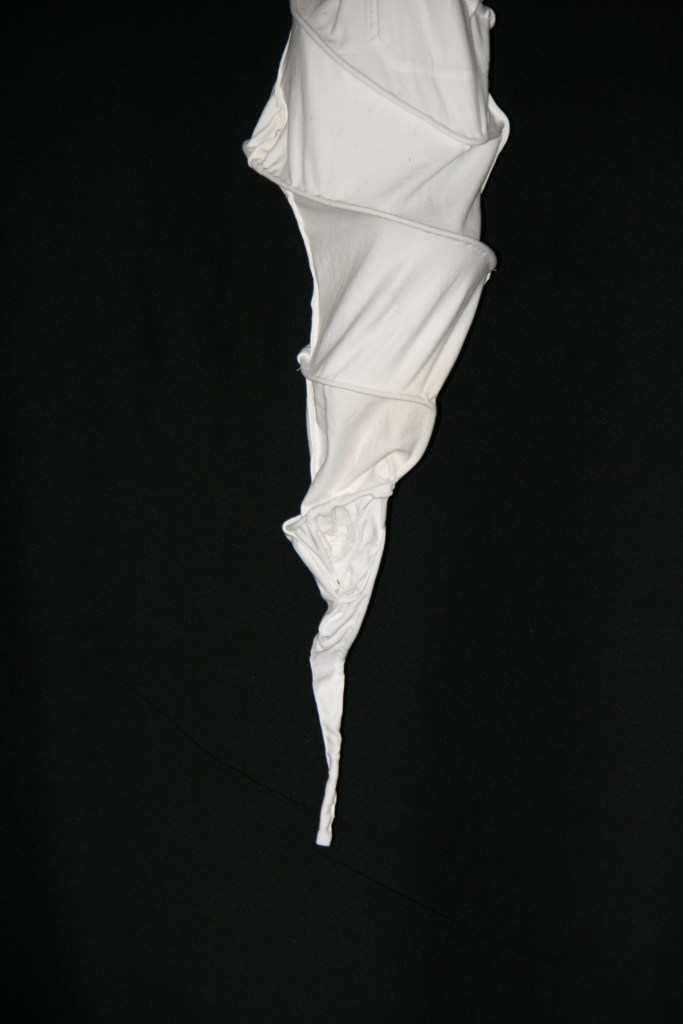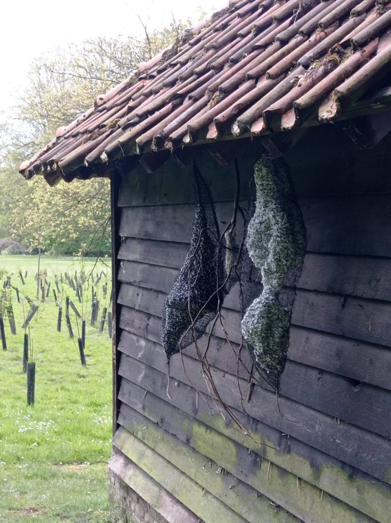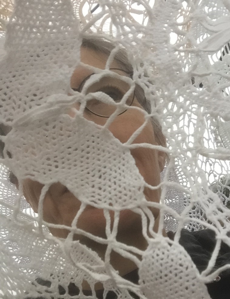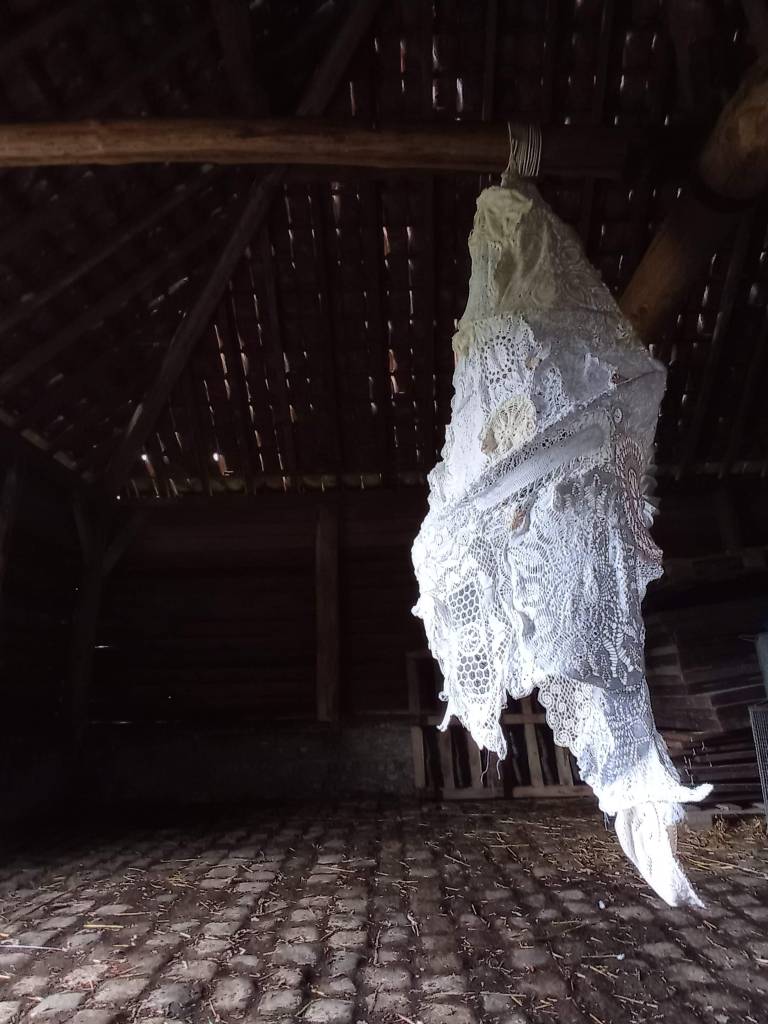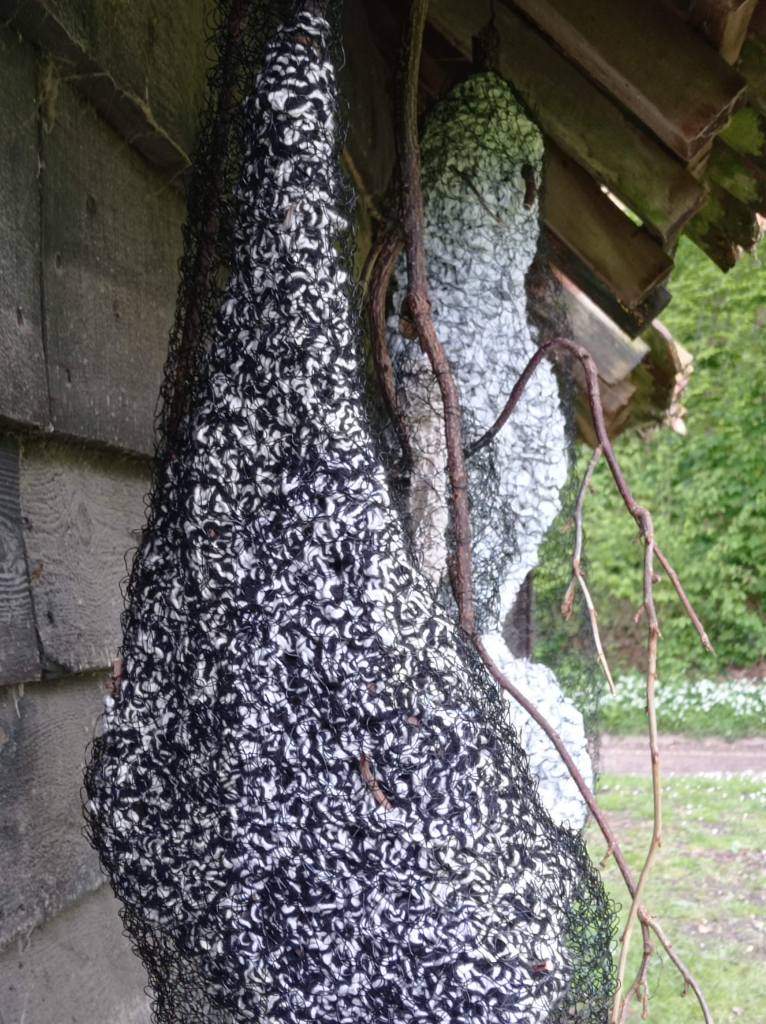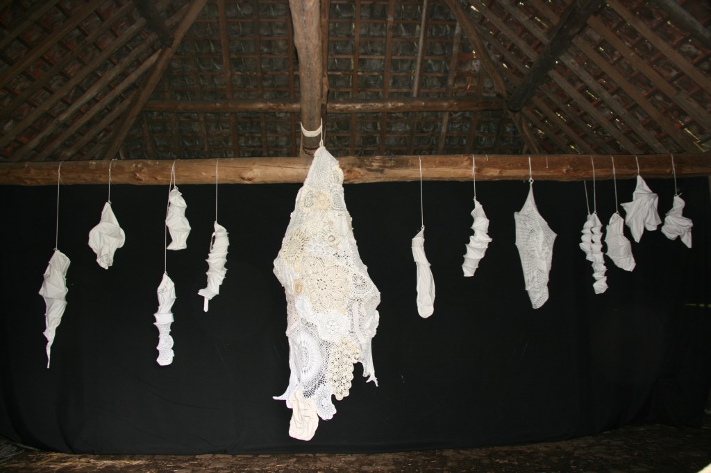 Zoals de natuur alles benut, werk ik liefst met gerecupereerd materiaal. Voor deze plek transformeerde ik oude gebreide, gehaakte, gekloste kantwerkjes en afgeschreven textiel tot een soort cocon. Inspirerend vind ik de weefsels die rupsen spinnen om zich te verpoppen tot vlinder. Door de klimaatverandering hebben vele levensvormen moeite met aanpassen aan hun snel veranderende omgeving. Ze sterven uit of zijn bedreigd, zo ook vele vlindersoorten.