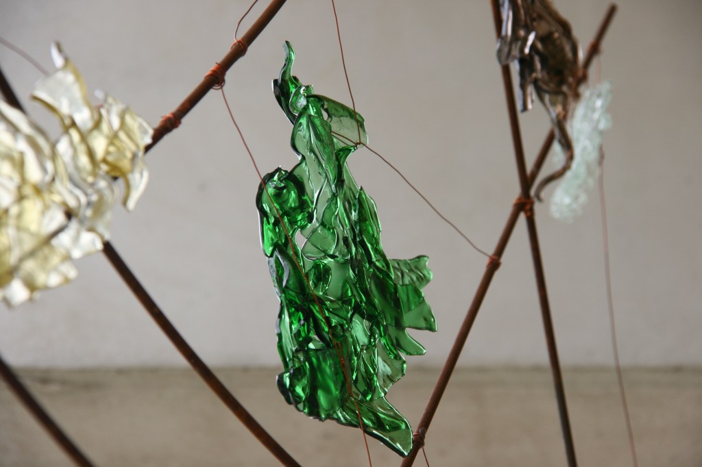 Ijzeren frame met geslumpte glazen ornamenten
