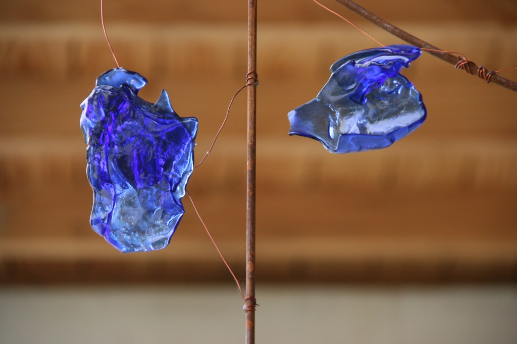 Met deze waarneming in mijn achterhoofd maakte ik 7 mallen. Oud, gebruikt en stuk geklopt glas in deze mallen laten slumpen, toverde een reeks fascinerende transparante vormen. Ze zijn creatief samengebracht in deze opstelling. De frames zijn uit geoxideerd ijzer: tevens een natuurlijk procedé.