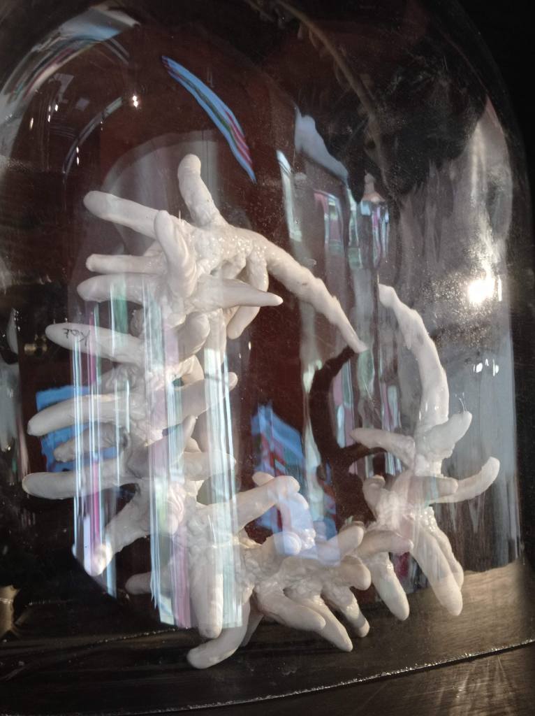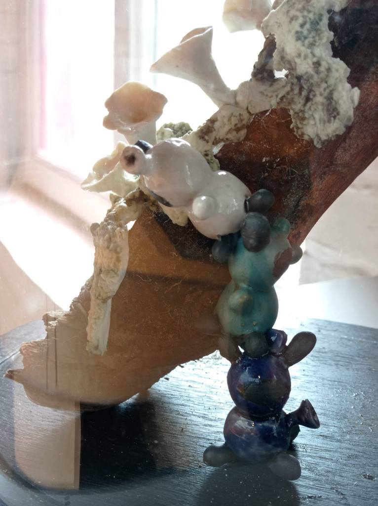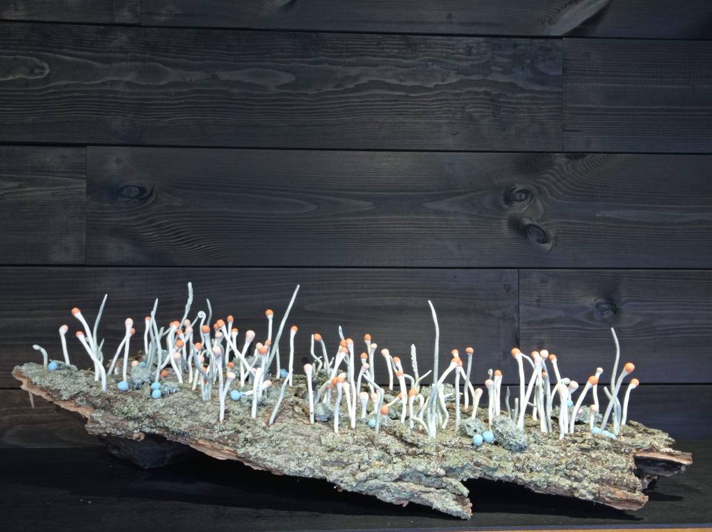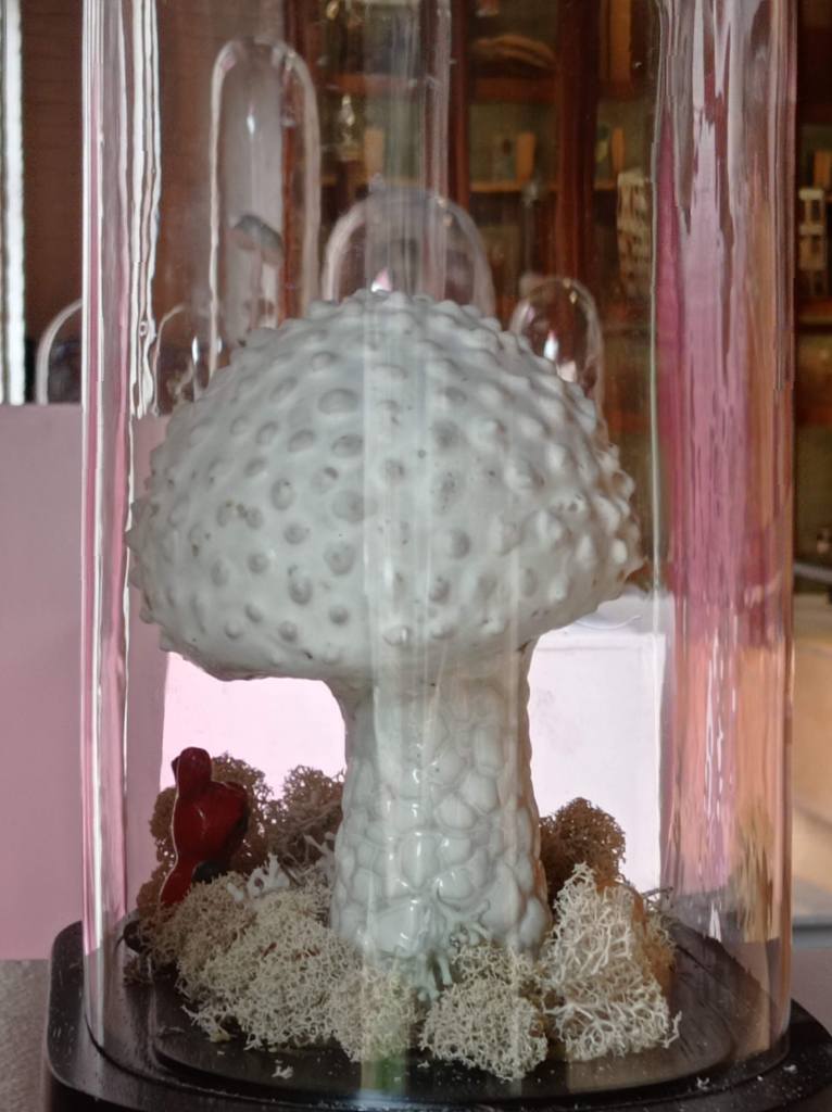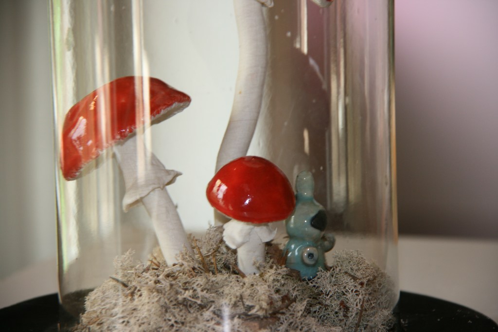 There I was, in the middle of this enchanting scene collecting beechnuts, acorns, chestnut husks, lichens and thistles which I dipped in paper porcelain. Mushrooms and cocoons came to life in with my hands. Earth crusts took shape with wild clay. I put together compositions under cloches, on branches and bark.