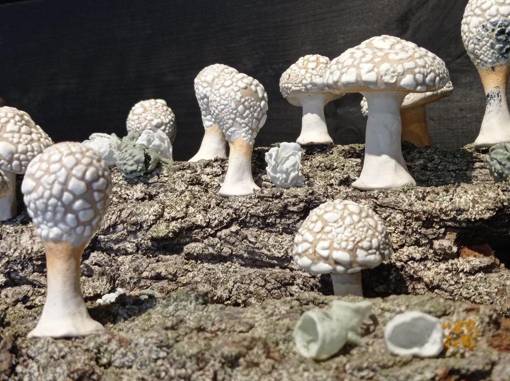 J’étais là, au milieu de ce décor enchanteur, à ramasser des faînes, des glands, des bogues de châtaignes, des lichens et des chardons que je trempais dans de la porcelaine de papier. Champignons et cocons ont pris vie dans mes mains. Des encroûtements de terre ont pris forme avec de l’argile sauvage. J’ai réalisé des compositions sous cloches, sur des branches et des écorces.