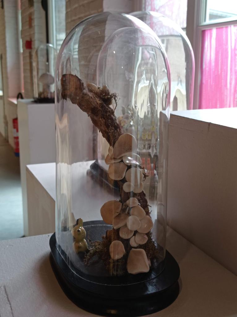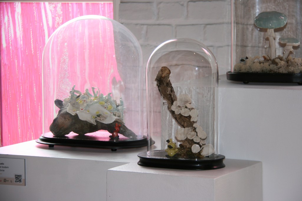 Daar was ik, midden in deze betoverende scène om beukennootjes, eikels, kastanjebolsters, korstmossen en distels te verzamelen die ik onderdompelde in papierporselein. Paddenstoelen en coconnetjes kwamen tot leven in met mijn handen. Aardkorsten kregen vorm met wilde klei. Ik stelde composities samen onder stolpen, op takken en schorsen. Met ‘Tot op de Bodem’ wil ik de bezoeker prikkelen om oog te hebben voor de knisperende symfonie van dood materiaal, waartussen zich een heel scala aan levendige verrassingen ontvouwt.