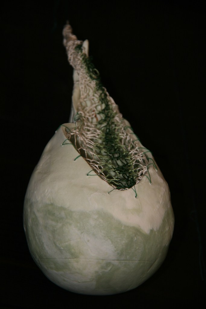 Keramiek (papierporselein, witbakkende klei, wilde klei) in combinatie met schors, hout, draad, stolpen.