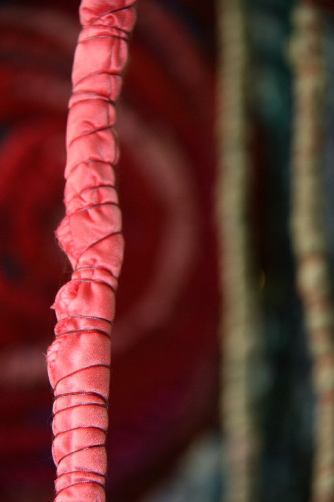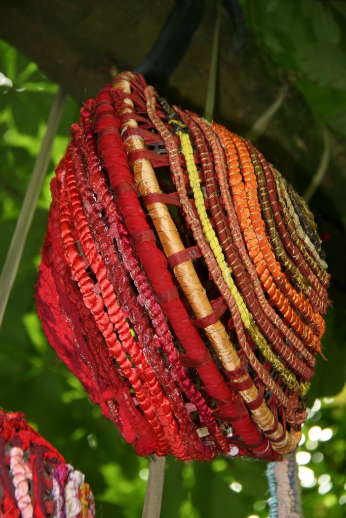 In assigning where my work would end up, among chestnut trees, I quickly thought of chestnut bolsters as a source of inspiration. But running some test pieces made me think of coronavirus altogether. Then I made half spheres with the material I had available. I work a lot with recycled materials. For this work, I got fabrics from a bridal shop, leftovers from bridal and suite wear. I brought all the pieces of fabric together and made cables and tied everything together with coloured stitching silk. To make a work with fabric that has to hang outside for 5 months and withstand all weather conditions, some tests have to be done. The work should not absorb too much water when it rains, and wind and sun also play a role. So the construction has to be very sturdy.