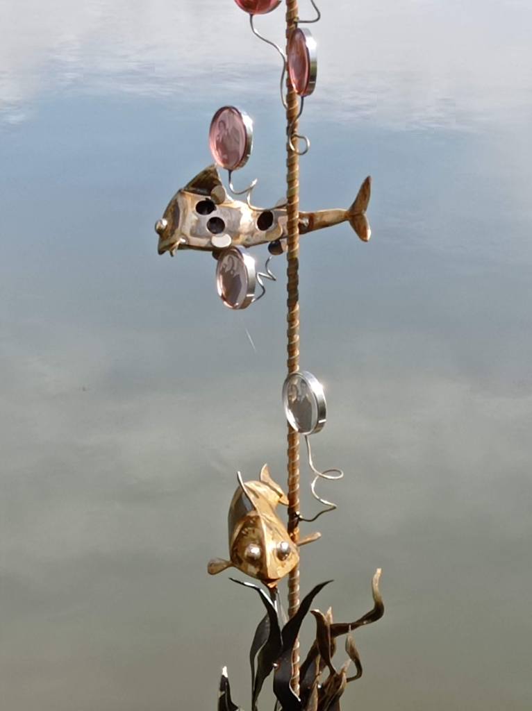 The work starts with a full fish emerging from below the surface of the water. As it rises higher, it begins to disintegrate into parts. At the end, only the soul and the bones remain.